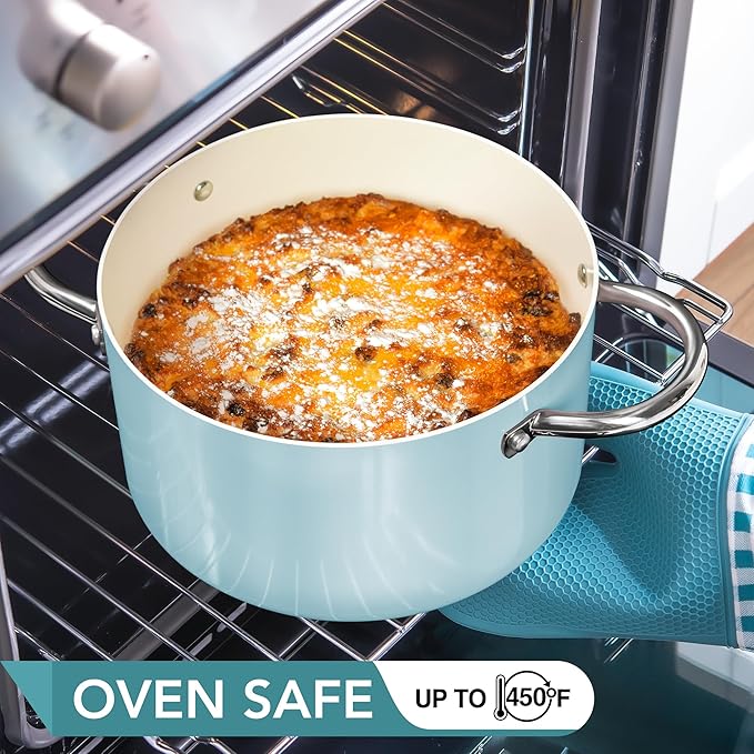 - Even Heat Distribution: The aluminum body provides superior heat conductivity, while the tri-ply bottom distributes heat quickly and evenly for enhanced flavor and texture. This nonstick pot is oven-safe up to 450°F for versatile stovetop-to-oven cooking.