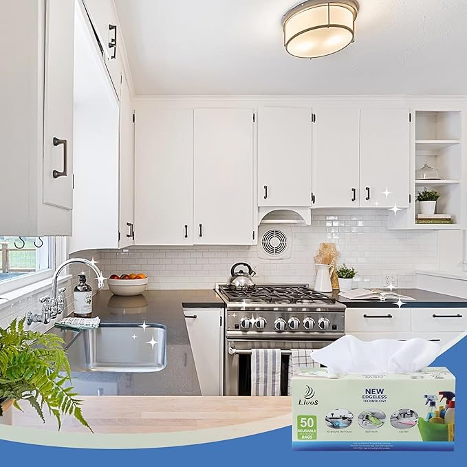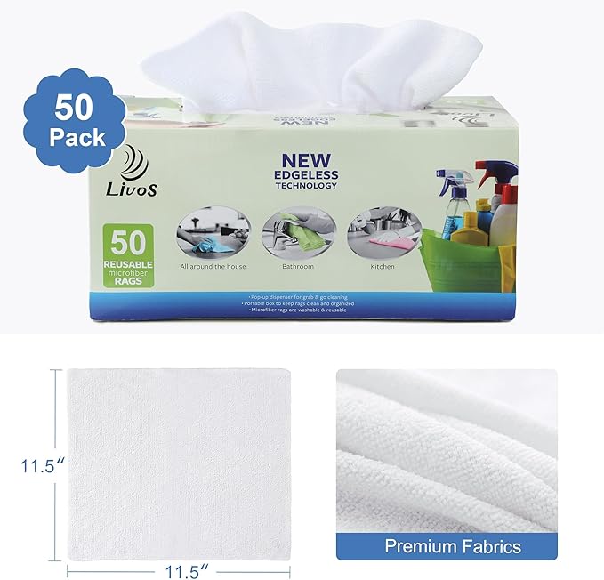 LIVOS 50 Pack Microfiber Cleaning Cloth in Box, Reusable Cleaning Rags, 11.5"x11.5", Edgeless Microfiber Wipes, Lint Free, Absorbent Shop Towels for Kitchen, Car, Glass (White)