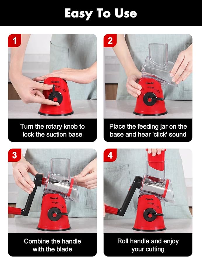 Geedel Rotary Cheese Grater Cheese Shredder - Upgraded 5-in-1 Cheese Grater with Handle and Strong Suction Base, Multi-purpose Vegetable Slicer Ice Shaver Nuts Grinder for Ice, Vegetables, Fruit, Nuts