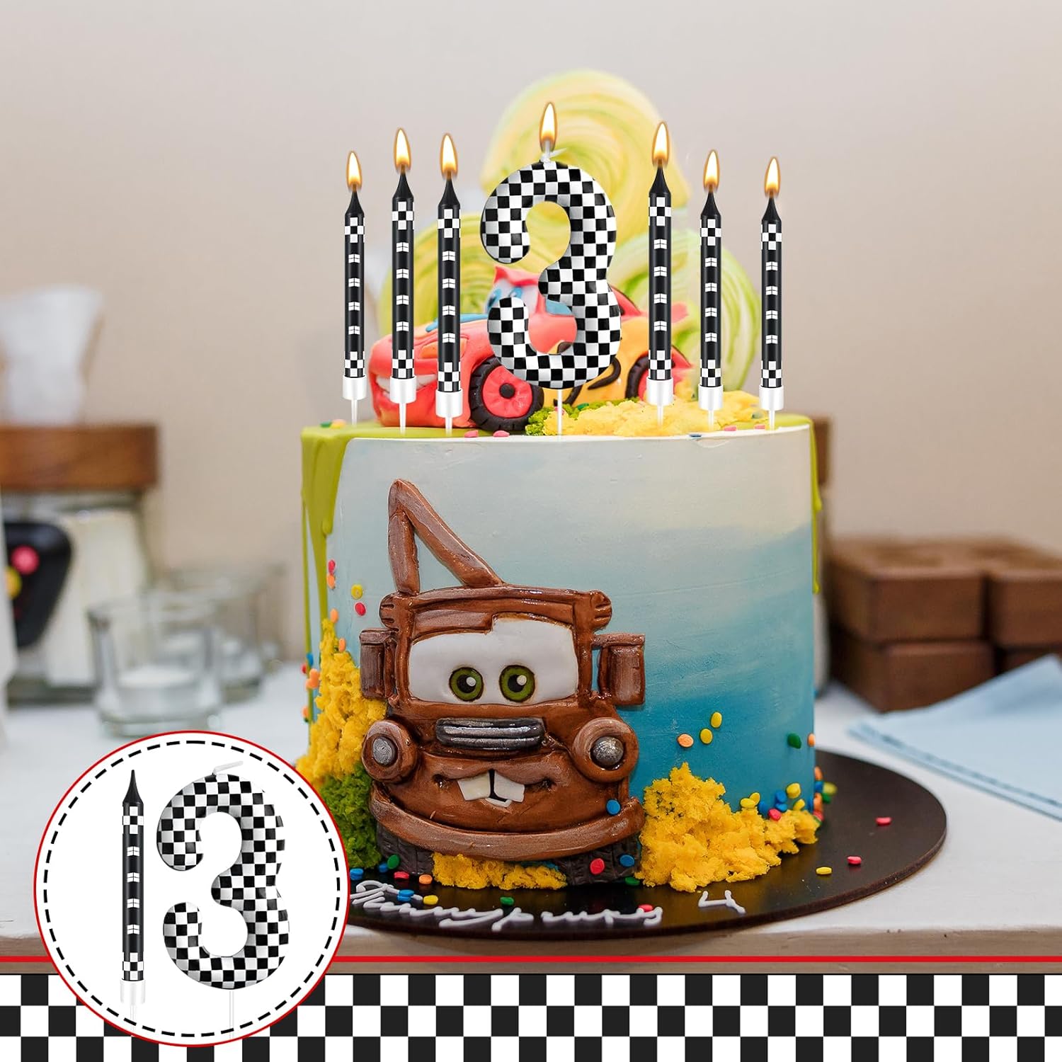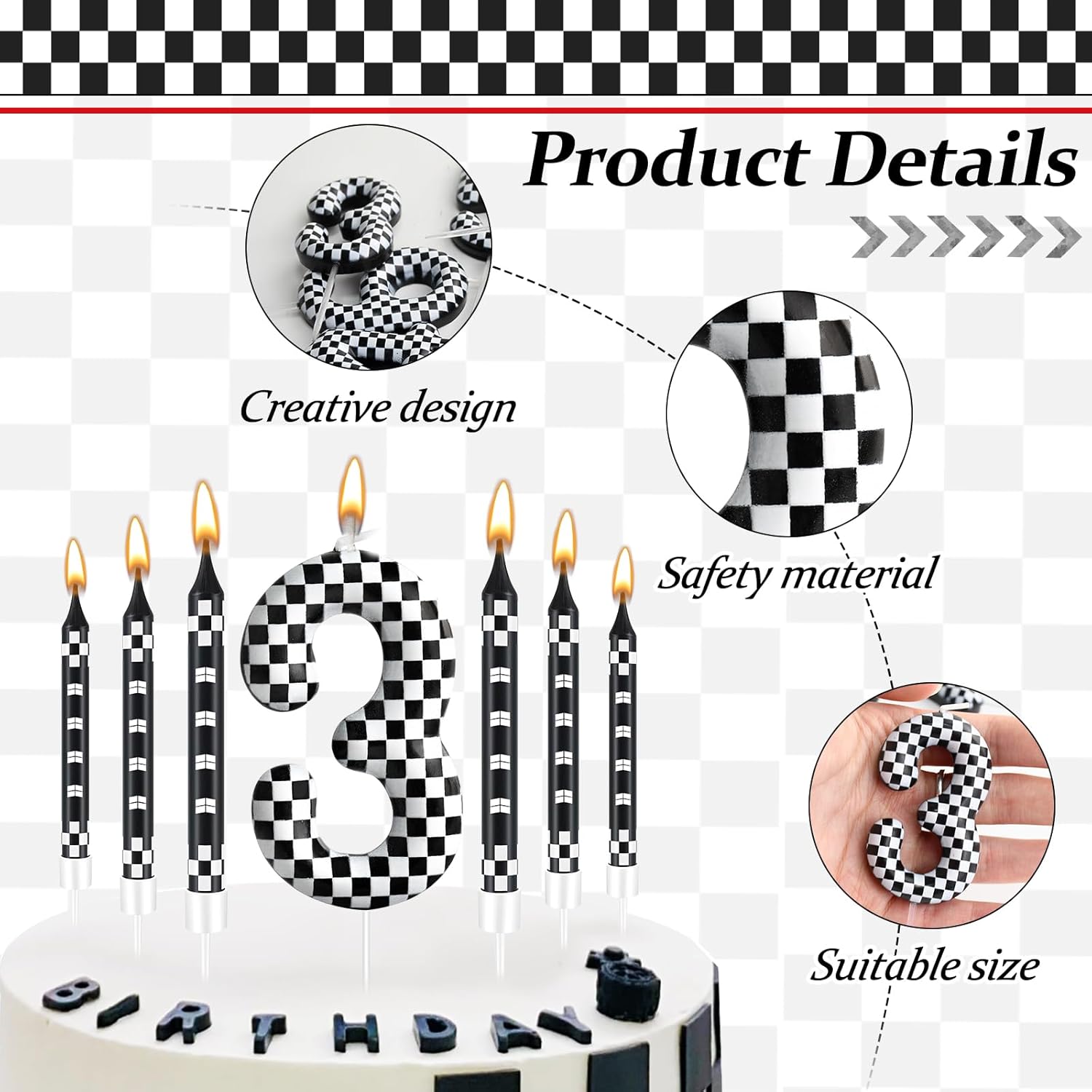 - The Package Includes: You will receive 12 black and white track car themed birthday candles and 1 number 3 black and white checkered candle, Sufficient quantity for birthday cake decoration or party celebration and daily use, note: the candle will slowly melt as it burns, and it is recommended not to leave it on the cake for more than two minutes