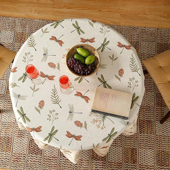 French Tablecloth for Round Tables,Linen Table Cloth with Flowers and Red and Green Dragonflies Pattern,Heavy Durable Table Cover for Dining Kitchen Decor Party Christmas,Diameter 67"