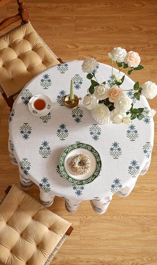 Floral Tablecloth for Round Tables,Linen Table Cloth with Blue Flowers and Green Leaves Pattern,Heavy Durable Table Cover for Dining Kitchen Decor Party Christmas,Diameter 67"