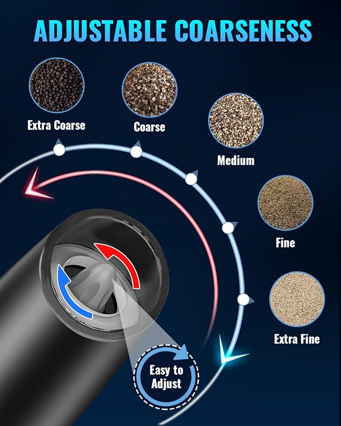 - 【USB Rechargeable】Upgraded electric pepper grinder with built-in rechargeable battery. Fast charging-full charge in one hour and can grind at least 100 grams of spice on a full charge. No need to spend extra money on batteries like other battery operated salt and pepper grinders.
