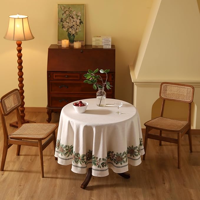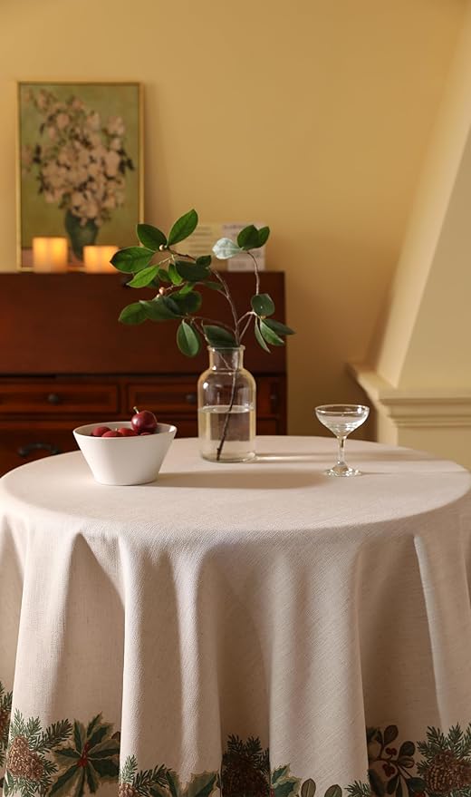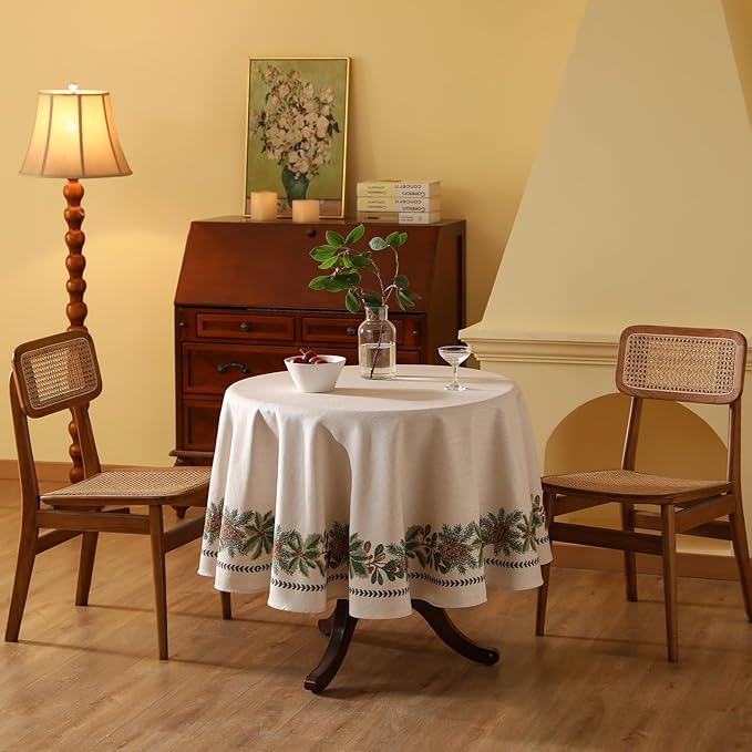 Christmas Tablecloth for Round Tables,Linen Table Cloth with Leaves and Pinecones Pattern,Heavy Durable Table Cover for Dining Thanksgiving Kitchen Decor Party Christmas,Diameter 55"