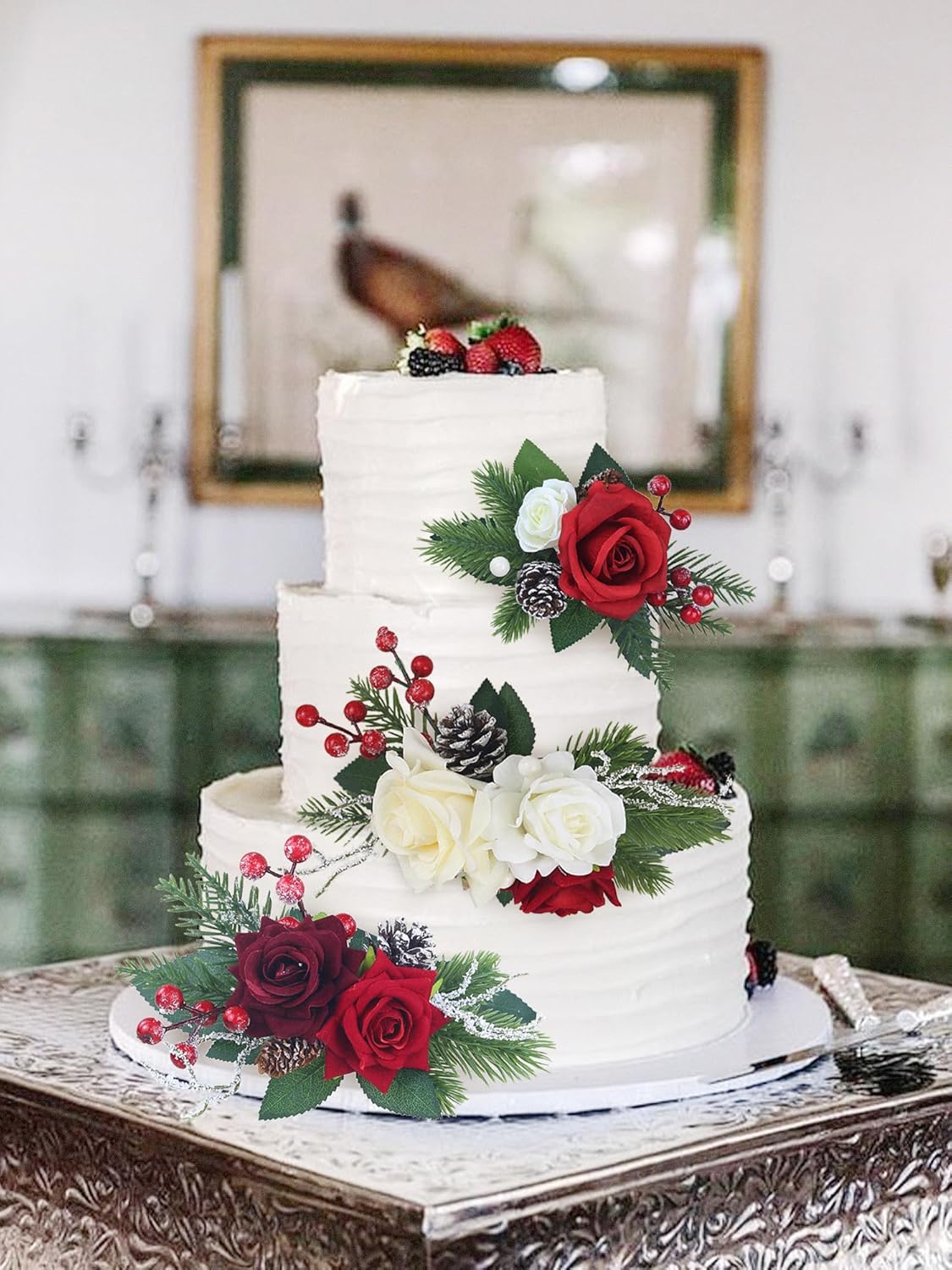 - Festive Christmas Decor: Perfect for Christmas celebrations, these pre-made cake toppers feature a beautiful blend of red and burgundy roses, white roses, pine cones, lush green pine needles, rose leaves, red berries, and white snowy twigs, creating a festive and charming decoration for your holiday cakes.