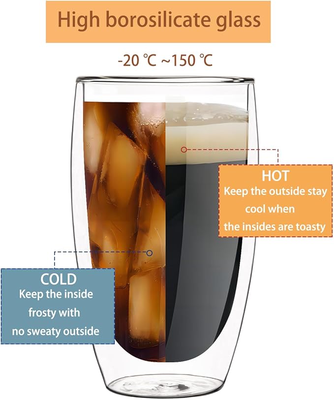 - No Burn Your Fingers - The double wall insulated glass design creates a thermal effect,keeping your drink hot or cold for ideal temperature while the outer glass remains safe to touch.
