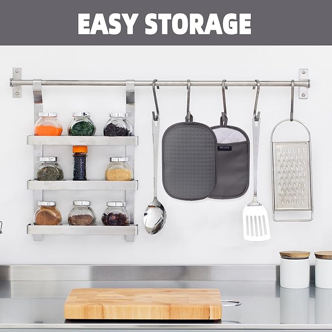 - 【INNOVATIVE POCKETS FOR HASSLE-FREE HANDLING】Equipped with thoughtfully designed pockets, our pot holders for kitchen offer a secure and comfortable grip when handling hot cookware. This innovative feature of this hot pads enhances maneuverability, making cooking and baking tasks more convenient and safe. Each pot holder has a convenient hanging loop for decorative display or storing when not in use.