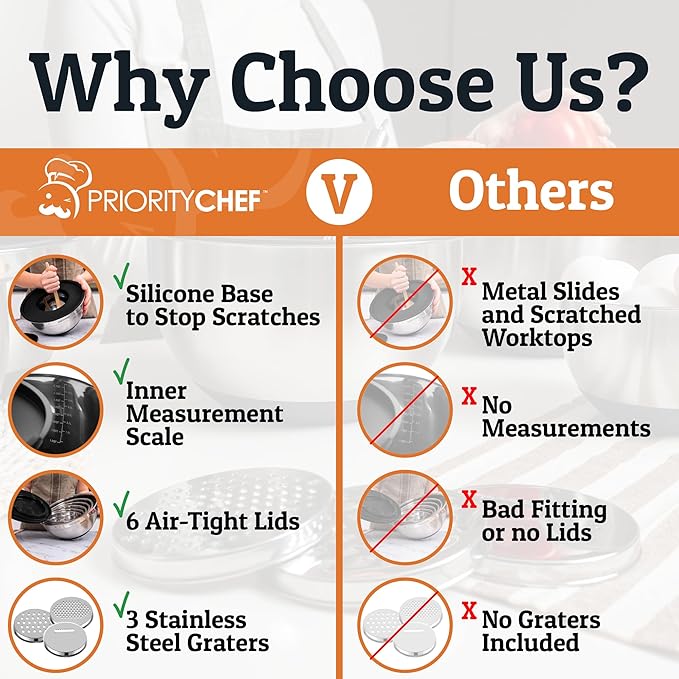 Priority Chef 6Pc Large Mixing Bowls With Lids Set with Non-Slip Bases, Stainless Steel Mixing Bowl Set, 6 Airtight Lids and 3 Graters, Black