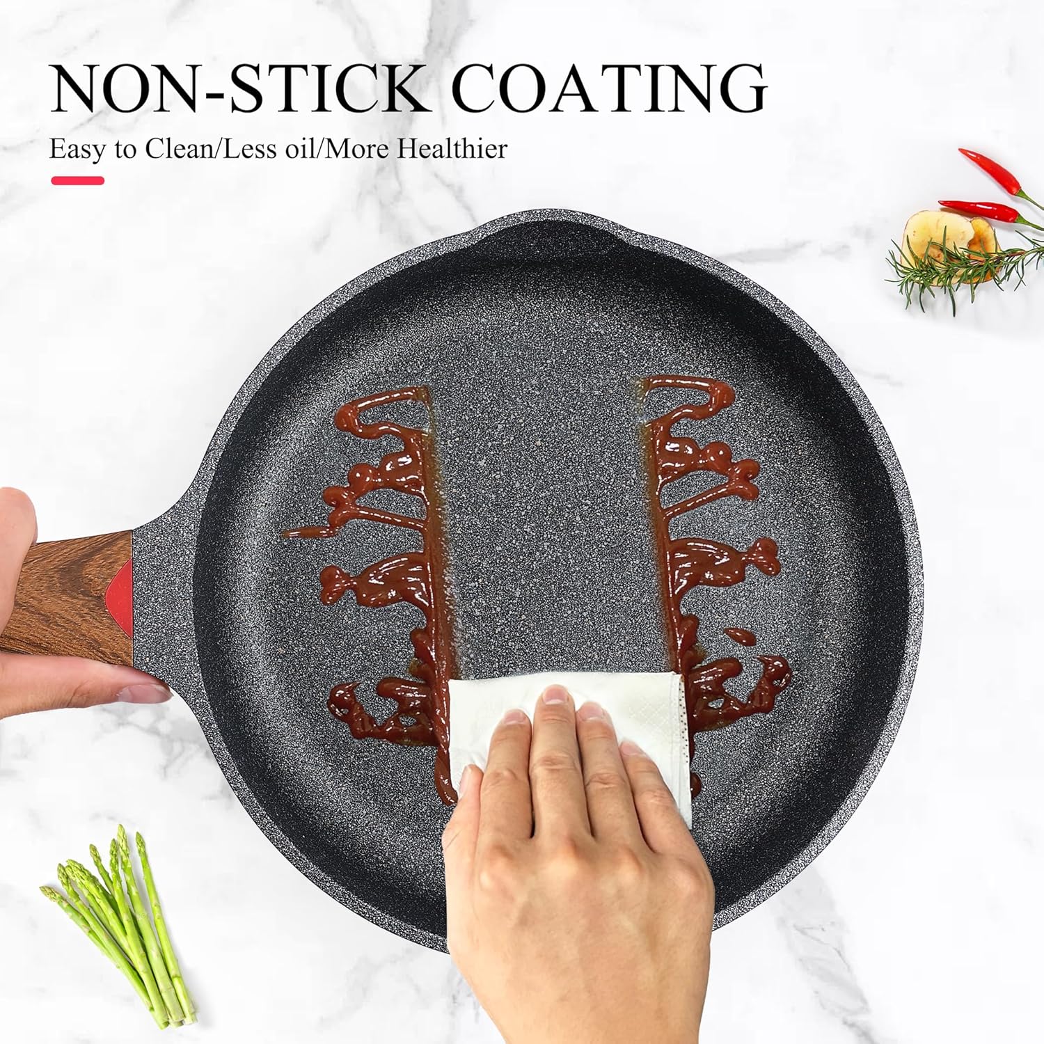 - Frying Pan with Anti-Scratch Technical - Anti-Scratch Technical imported from Germany and turely Non-Stick coating. The slippery, nonstick surface and no rivets design make the frying pan easy to clean in seconds with a towel, soap and warm water. You can use metal utensil,wooden or silicone ones. Recommend Hand Washing to extend the life of pans.