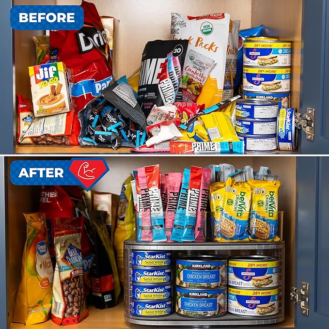 - MAXED-OUT STORAGE. Her rectangular, 2-tiered design sits front and center, swinging out over the edge as she spins. This maximizes your storage area by 20% more compared to the typical, round Lazy Susan. Required cabinet depth of 11” for proper fit. This space saver is a rotating 360-degree can organizer for pantry, canned goods, spice, and seasoning rack, making it one of the great kitchen spice organizers and storage solutions available.