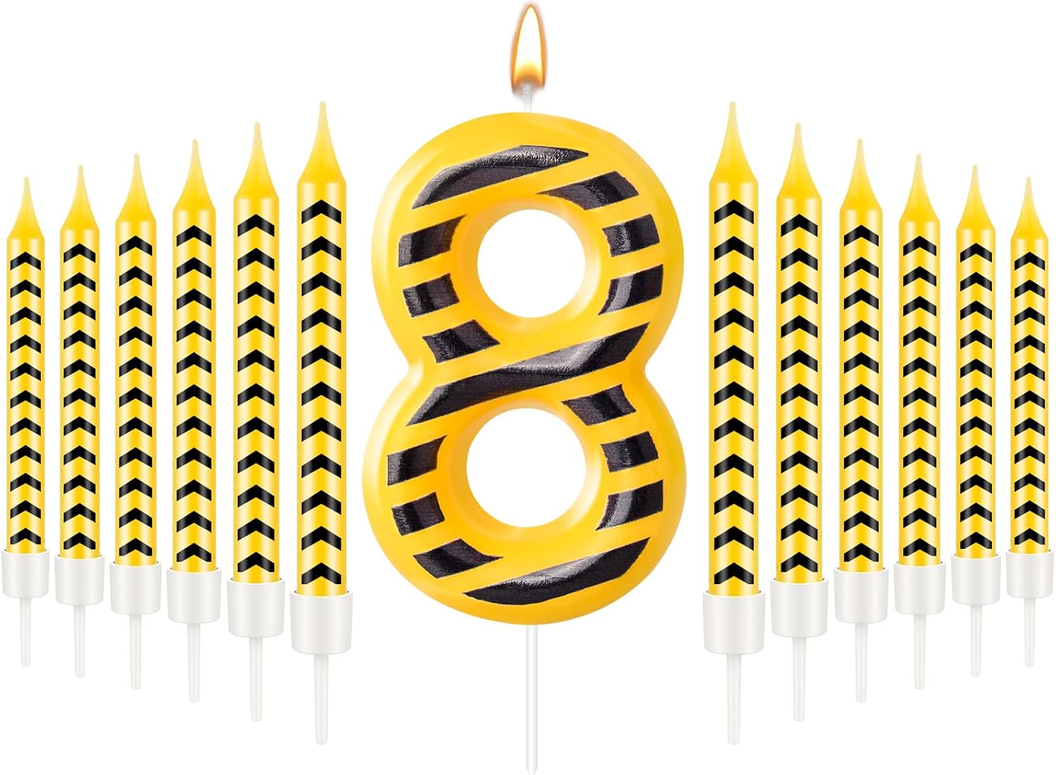 13 Pcs Construction Themed Birthday Candles Set Yellow and Black Number 8 Candle Cake Topper for Construction Party Decoration Supplies (Number 8)