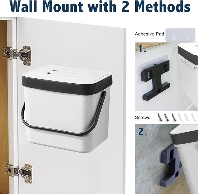 - Wall Mount/Under Sink/Hanging Grabage Can: The small compost bin can be easily hung on kitchen cabinet doors, pantry doors. (The thickness of the door should be less than 0.86 inch) Moreover, this small plastic garbage can also be wall-mounted to under sinks, cupboard, kitchen wall with adhesive pad or screws.