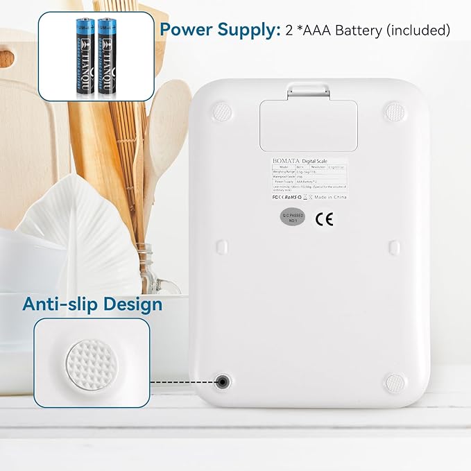 - [ Materials; Power ]: Stainless steel weighing pan; Touch-sensitive buttons; LCD display with backlight; Powered by two AAA batteries (included)