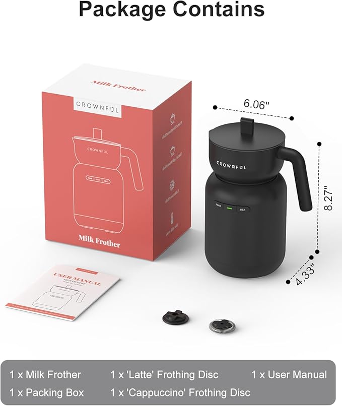 - [Creamy Milk Froth] This CROWNFUL Milk Frother and Steamer swiftly produces smooth and velvety milk foam, which is ideal for improving the flavor and appearance of your cappuccinos, lattes, macchiatos, iced coffee, and more. In warm milk mode, the milk will gradually reach a temperature of 104℉±5. In hot milk mode, the milk will gradually reach a temperature of 140℉±5.