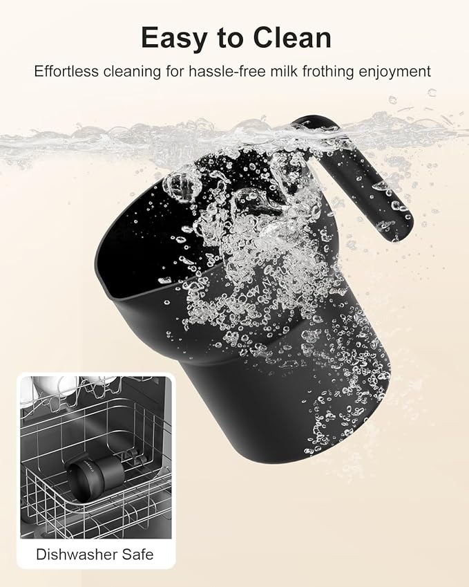 - [Safe and Reliable] The ETL certification and temperature control provide both convenience and safety. The frother automatically turns off when the foam or milk reaches the required consistency, preventing scorching or overheating. The milk jug can be easily cleaned in the dishwasher and is made of non-scratch material. To avoid the milk leaked, the recommanded capacity for heating milk is 300ml, and for frothing milk is 150ml.