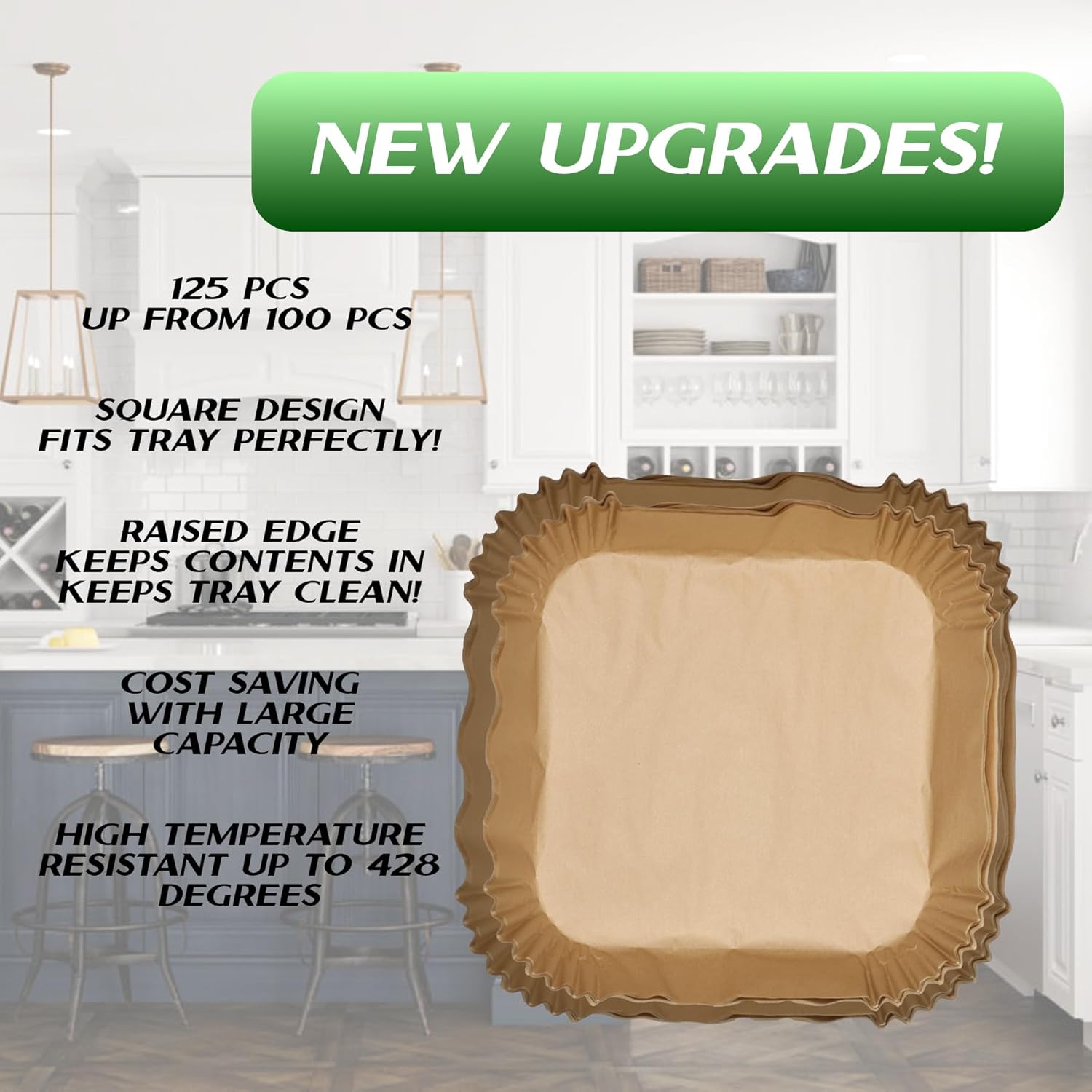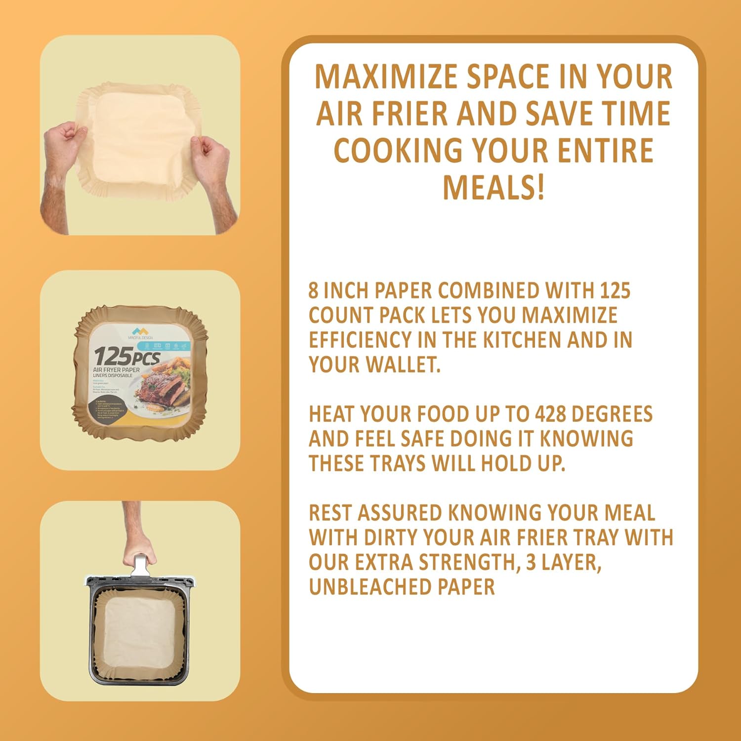 - Customized Convenience: Each pack includes 125 pre-cut 8-inch square liners, eliminating the hassle of trimming or folding to fit your air fryer. Enjoy the convenience of perfectly sized liners every time.