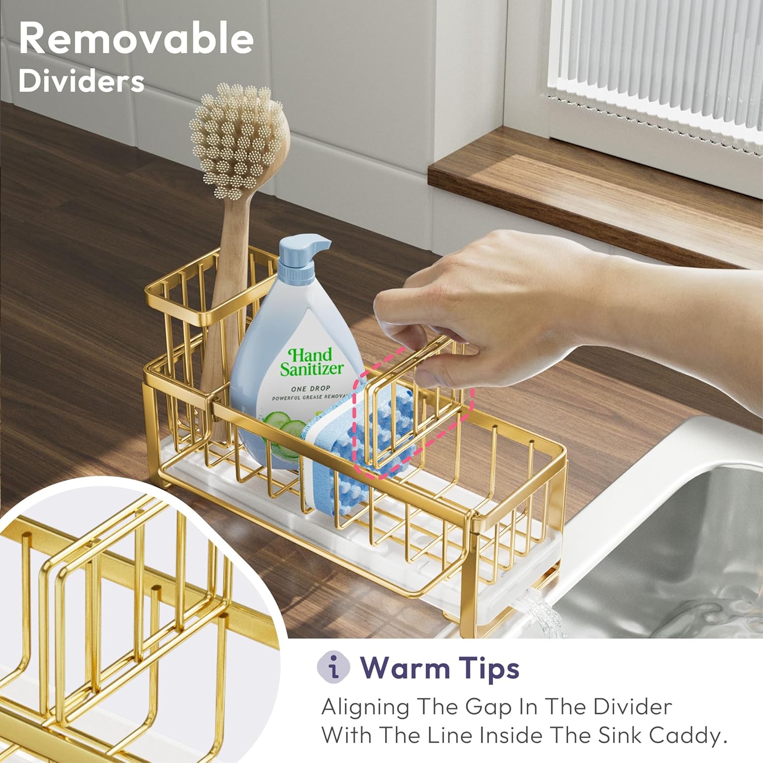 SWTYMIKI Sponge Holder for Kitchen Sink - Sink Caddy with Brush Holder Self-draining Sponge Caddy Organizer with Divider Stainless Steel Kitchen Accessories Storage for Countertop, Gold