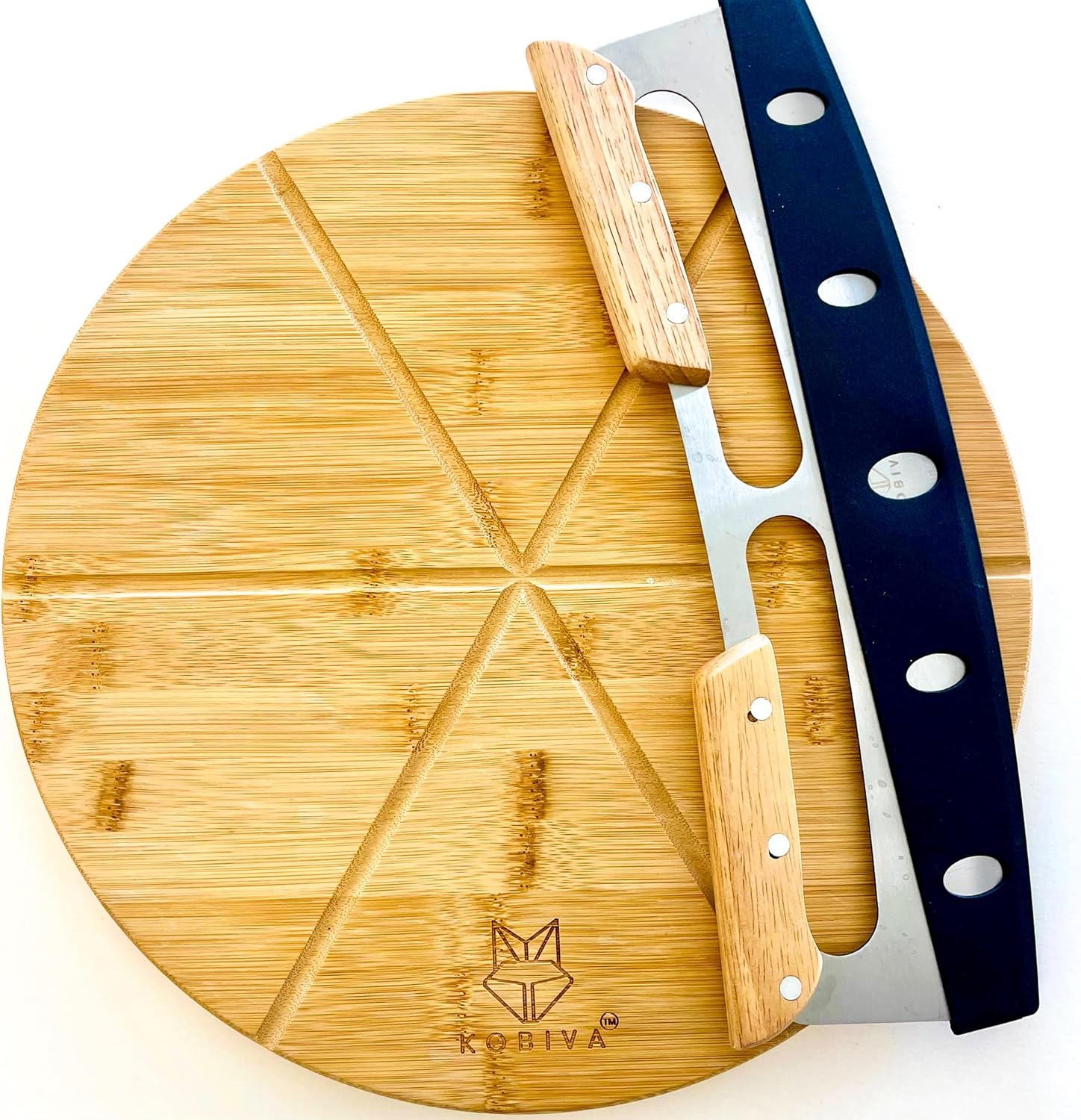 - [DOUBLE-GRIP] - Unlike other Pizza Board Knife sets, Kobiva's matching wooden ergonomic "double-grip" rocker pizza cutter knife is designed for effortless use on our grooved bamboo pizza board, it glides smoothly through thick crusts for perfect slices every time with maximum precision.