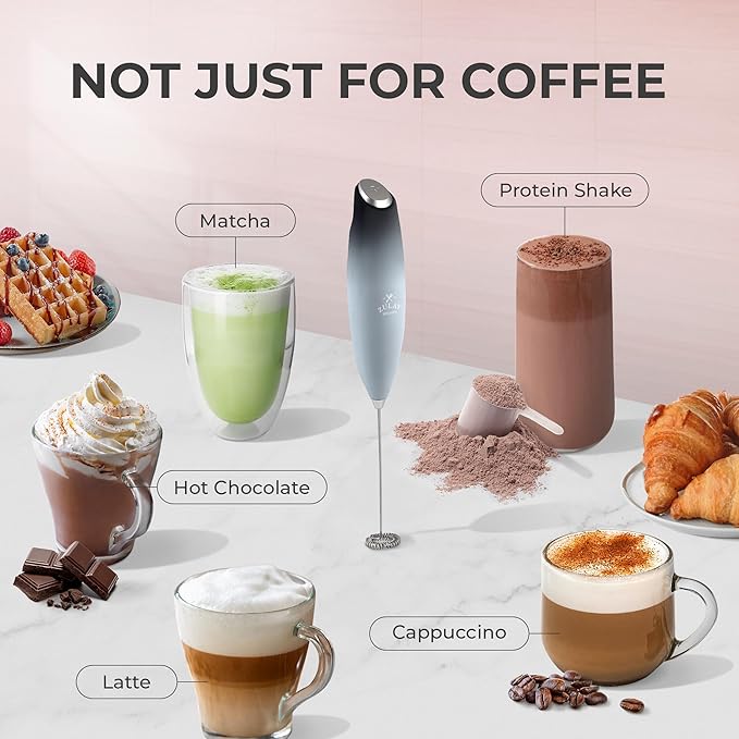- CREAMY VELVETY FROTH IN SECONDS: Making coffee-shop-style recipes at home is as simple as it can be with this milk frother. The 13,000 RPM motor and 25 spiral rings on the whisk let you whip up rich foam in no time. Level up your everyday warm or cold coffee, latte, cappuccino, hot chocolate, matcha, or powdered drinks with this coffee foam.