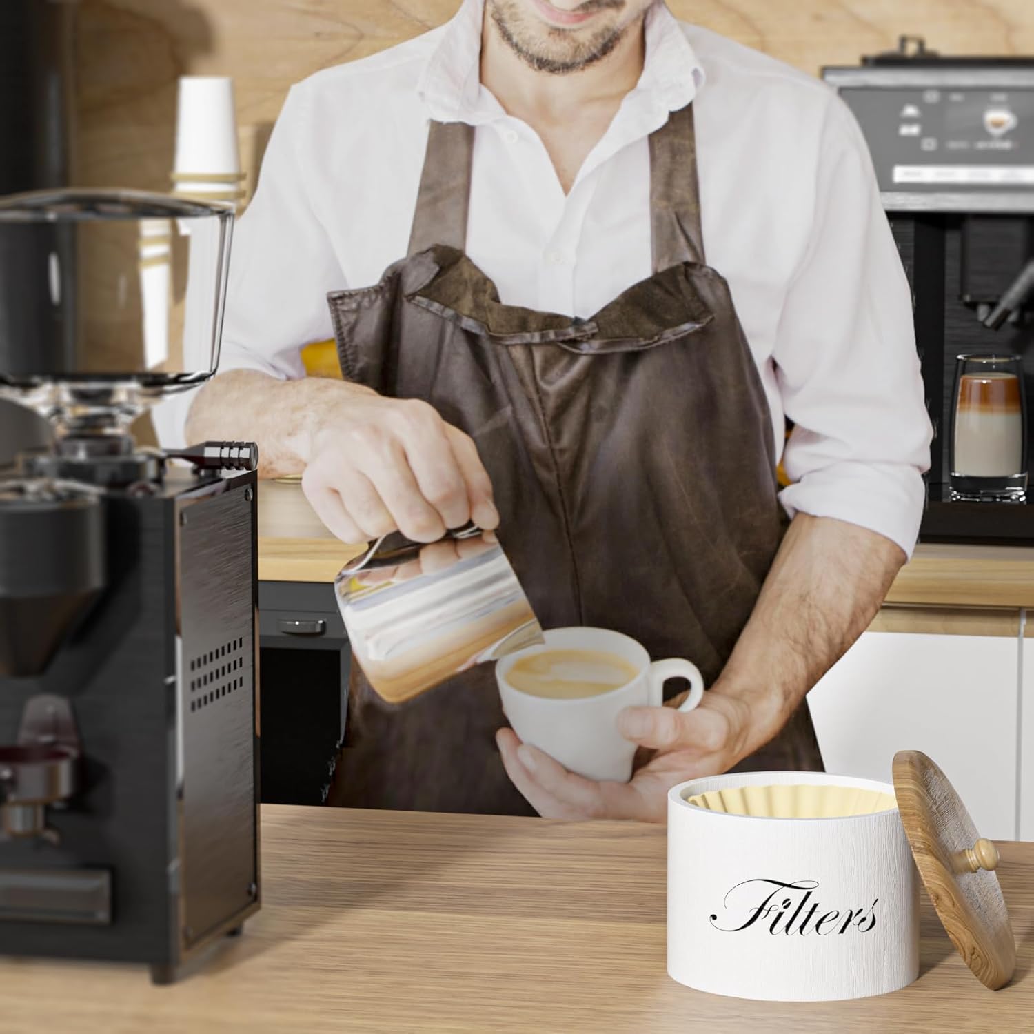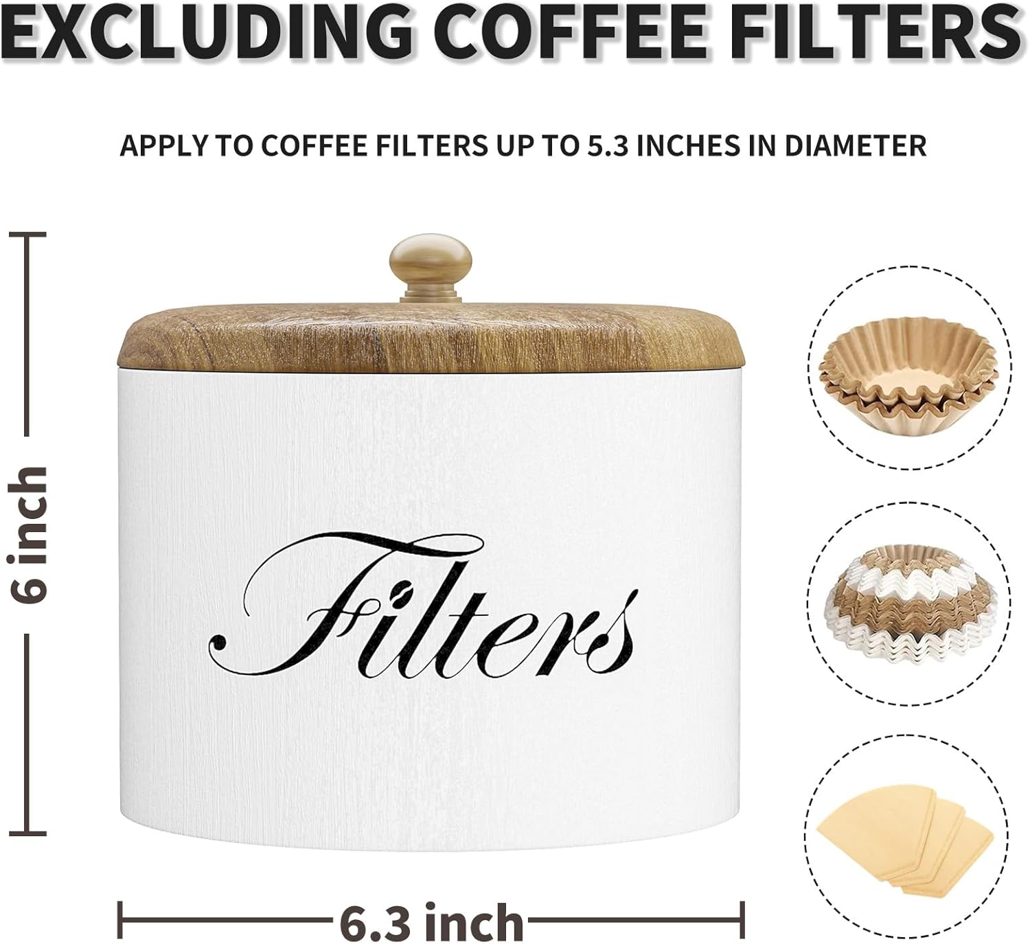 - COFFEE BAR DECOR ACCESSORIES : This coffee filter storage is great way to hide unsightly coffee filters without taking up space anymore! It is a nice addition to your coffee bar decor. The round can be placed anywhere near the coffee machine, on the counter or on a shelf, it is easier to reach than a wall-mounted coffee filter holder and saves you brewing time