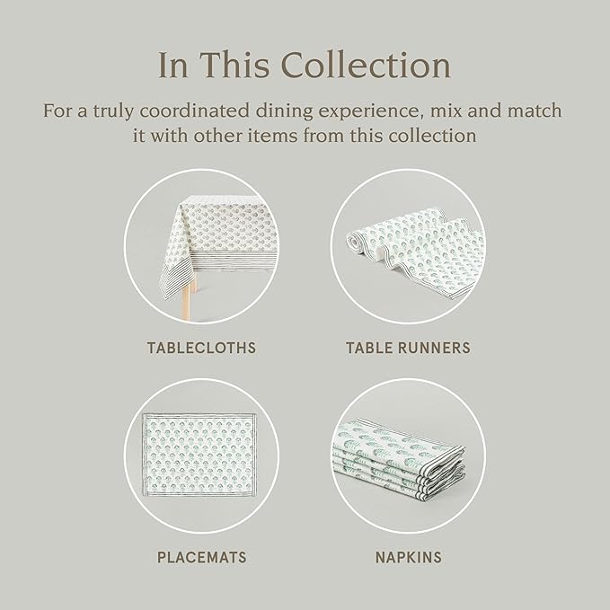 - MIX-AND-MATCH: All our hand-screened tablecloths use the same color palette to easily blend with all of our collections. Feel free to mix our prints with our woven stripes or even our 100% solid linens to create your own personal style.