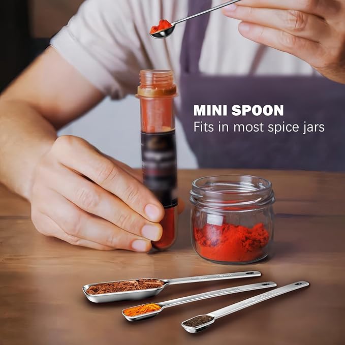 - Professional 20-Piece Set: Includes 7 Measuring Cups (1/8 cup, 1/4 cup, 1/3 cup, 1/2 cup, 2/3 cup, 3/4 cup, 1 cup), 7 Measuring Spoons (1/16 tsp, 1/8 tsp, 1/4 tsp, 1/2 tsp, 3/4 tsp, 1 tsp, 1 tbsp), 1 Leveler & 5 Mini Teaspoons (Tad, Dash, Pinch, Smidgen, Drop). Meet all your needs on cooking and baking.