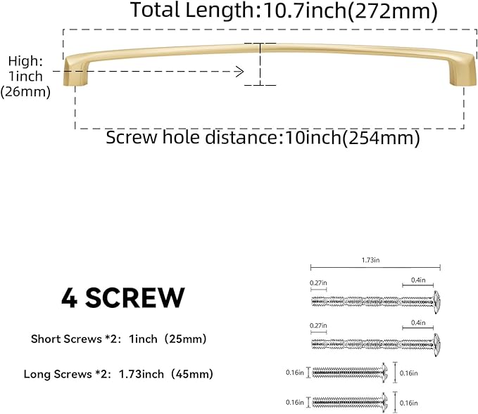 - 【Package includes】10 inch Cabinet Handle X 6 , each handle comes with 4 screws respectively 1 inch (25mm) screws x 2, split screws (45mm) x 2 (custom length available). You can choose the right screws according to the thickness of the cabinet. Each drawer handle is individually packaged to ensure excellent quality and prevent color fading.