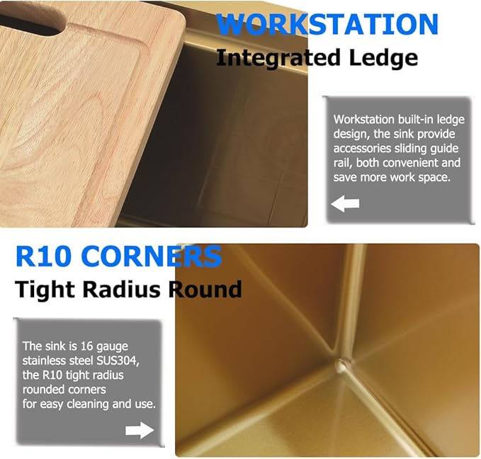 - Superior Features: This stainless steel kitchen sink has extra thick rubber dampening pads to minimize noise and heavy duty stone guard undercoating to prevent condensation and protect kitchen cabinets. The R10 Tight Radius round corners for easy cleaning