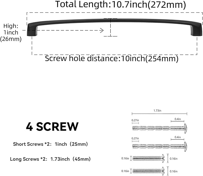 - 【Package includes】10 inch Cabinet Handle X 6 , each handle comes with 4 screws respectively 1 inch (25mm) screws x 2, split screws (45mm) x 2 (custom length available). You can choose the right screws according to the thickness of the cabinet. Each drawer handle is individually packaged to ensure excellent quality and prevent color fading