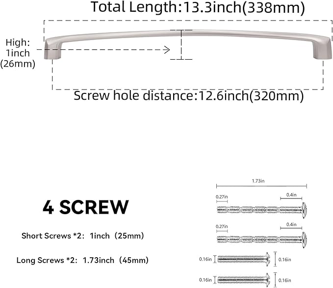 - 【Package includes】12-3/5 inch Cabinet Handle X 6 , each handle comes with 4 screws respectively 1 inch (25mm) screws x 2, split screws (45mm) x 2 (custom length available). You can choose the right screws according to the thickness of the cabinet. Each drawer handle is individually packaged to ensure excellent quality and prevent color fading