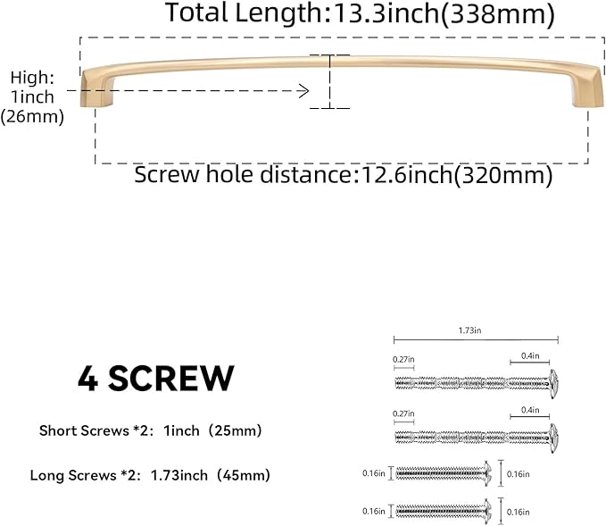 - 【Package includes】12-3/5 inch Cabinet Handle X 6 , each handle comes with 4 screws respectively 1 inch (25mm) screws x 2, split screws (45mm) x 2 (custom length available). You can choose the right screws according to the thickness of the cabinet. Each drawer handle is individually packaged to ensure excellent quality and prevent color fading