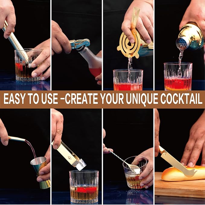 - 【Enjoy a happy bartending time】 Whether you are a professional bartender in a bar or a beginner who wants to try bartending at home, this cocktail shaker set can help you easily mix whiskey, tequila, duo Enjoy your own wine tasting time with drinks made from ginseng, rum, brandy, and other alcoholic beverages.