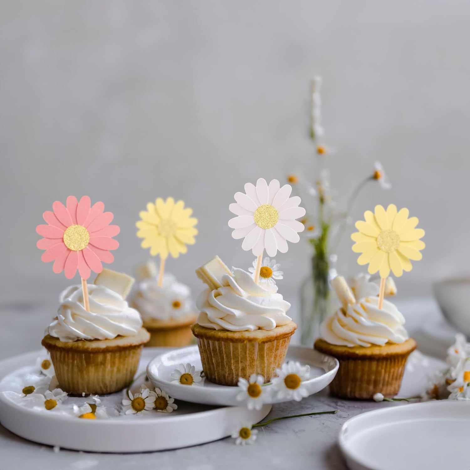 - 【NO Required】: 24Pcs Daisy Flower Cupcake Toppers can put in the cake directly! These Daisy Flower Cupcake Toppers saves your time and super easy to use. You can easily dress up your birthday theme cakes, yes! but don't stop there, put them into desserts, cookies, fruit pieces, appetizers, muffins and so much more!