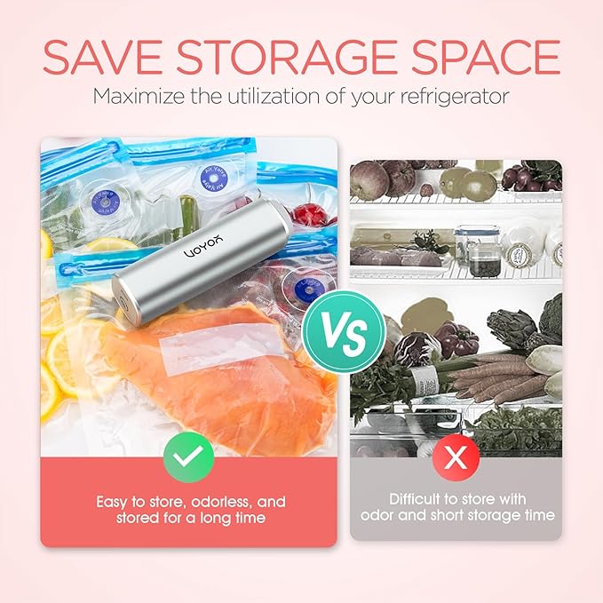 - Food Preservation & Save Space: This portable vacuum sealer VS210 effortlessly helps extend the shelf life of your food, preserving its flavor.In addition, it can also facilitate storage, save space, and maximize the use of the internal space of the refrigerator.