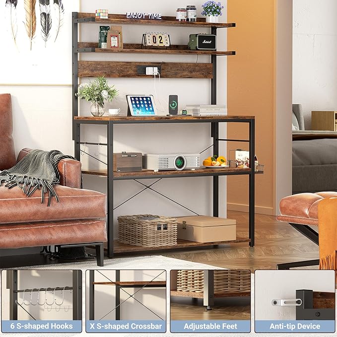 Aheaplus Bakers Rack with Power Outlet, Microwave Stand, 5 Tiers Coffee Bar Station with Led Lights, Kitchen Storage Shelf with 6 S-Shaped Hooks, Kitchen Rack Coffee Bar Stand, Rustic Brown