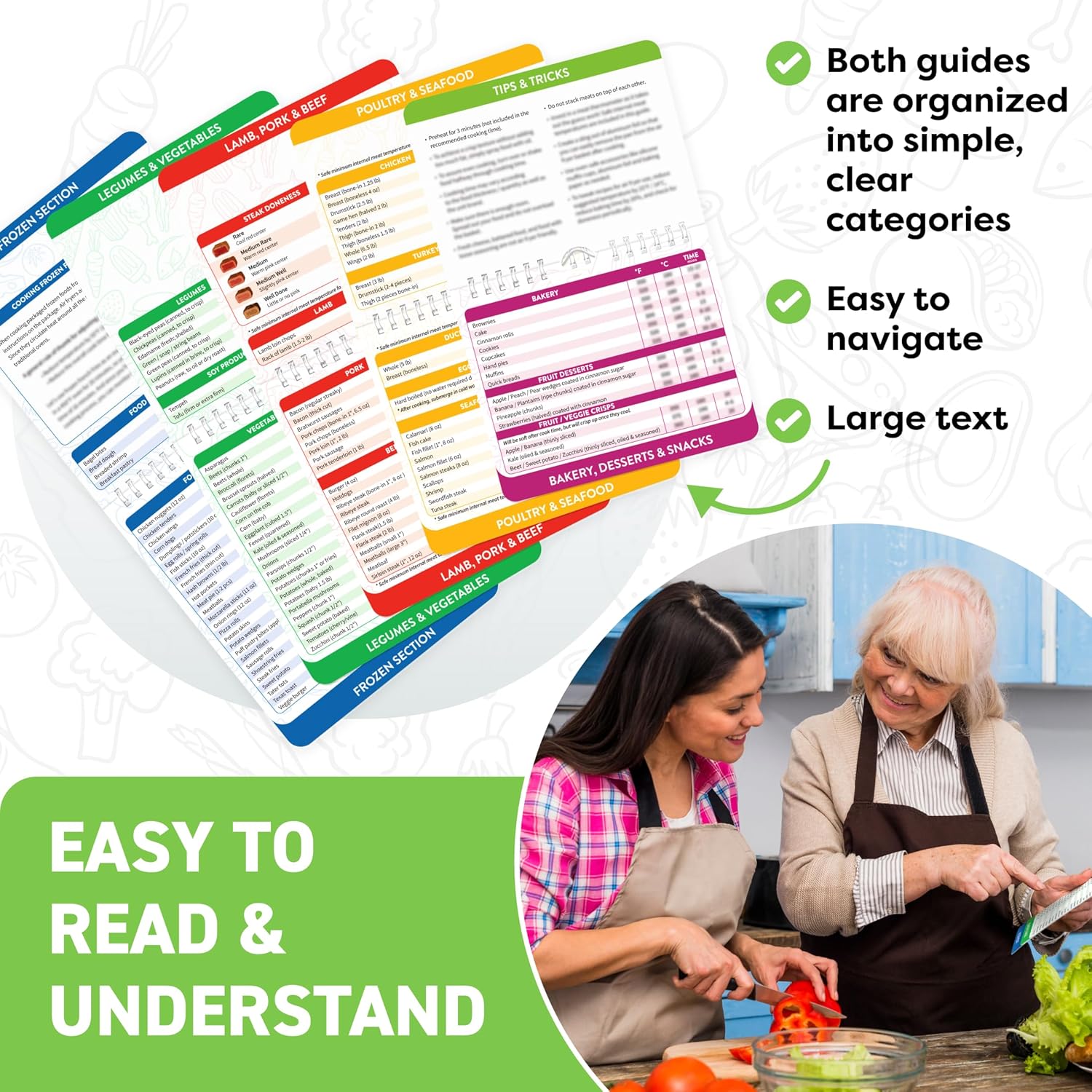 - Air Fryer Accessories Magnet has over 120+ food entries conveniently organized into 5 airfryer categories. With clear cooking time instructions and temperatures in both Fahrenheit and Celsius. Food weights are displayed in ounces, pounds and inch-size. Instantly find ideal cooking times for anything you want to eat in just a minute, ensuring perfectly cooked food every single time.