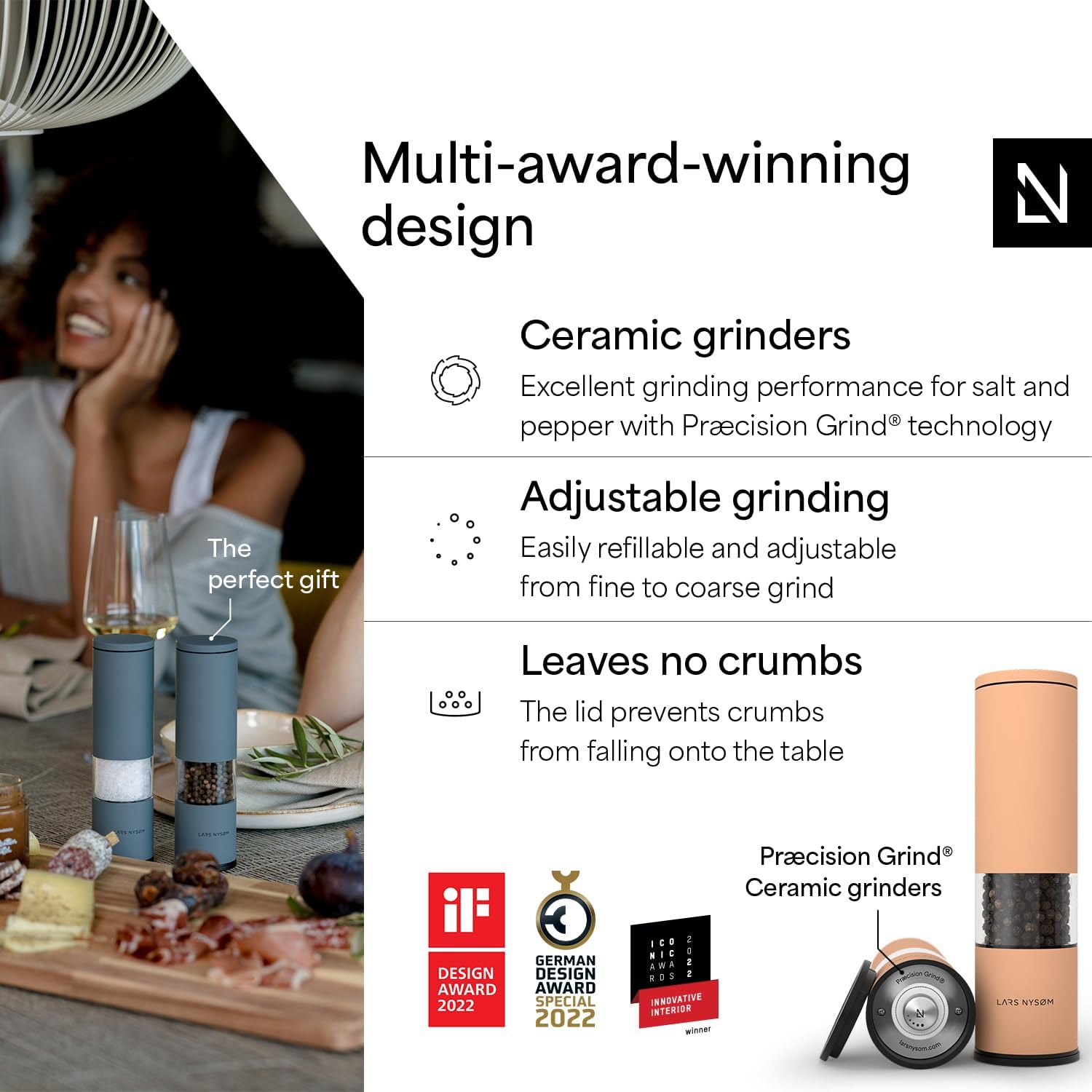 - DESIGN SPICE MILL SET (2 pieces): The salt and pepper mill set "Lagom" by LARS NYSØM impresses with functionality and design. Perfect for everything that adds spice to life - whether pepper, salt,
