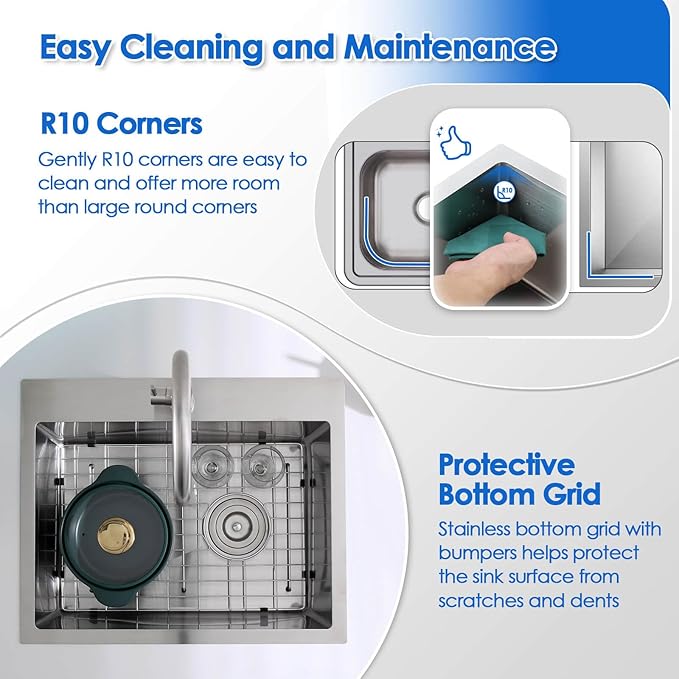 - Enhanced Functionality and Maintenance: Designed with channel grooves and a slightly sloped bottom, this sink ensures optimal drainage. The included stainless steel bottom grid protects the sink from scratches and dents, while R10 corners allow for easy cleaning and maintenance.