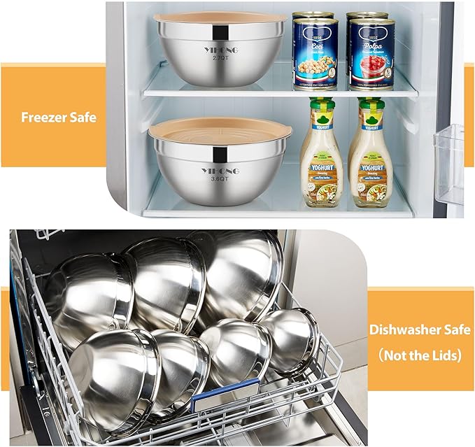 - Durable and High Quality — Made of high-quality stainless steel for lasting use, which is resistant and rustproof. These mixing bowls are dishwasher safe, more convenient for you and your family.