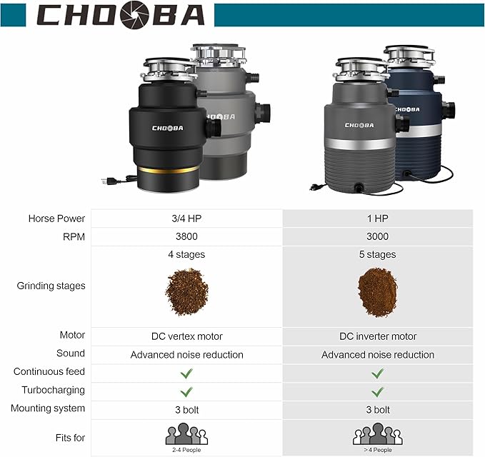 - 4 Stages Garbage Disposal - Chooba food disposal adapts 4 stages stainless steel grinding system. Multi-dimension grinding with 3800RPM high speed DC vortex motor can easily turn fruits, vegetables, chicken bones, seafood shells, even tough small beef bones into 1-3mm particles.