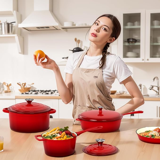 DishDelight Enameled Cast Iron Cookware Set, 7 Piece Set of Dutch Ovens, Sauce Pan, Skillet, 3 Lids, Ceramic Coated Cast Iron Dutch Oven Set, Pots and Pans Set Nonstick, Red