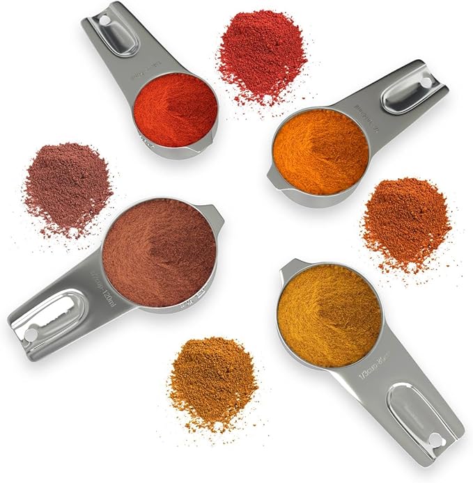 - Features stamped measurements on the handle and outside of each cup. Partial stamped measurements on the interior of each cup.