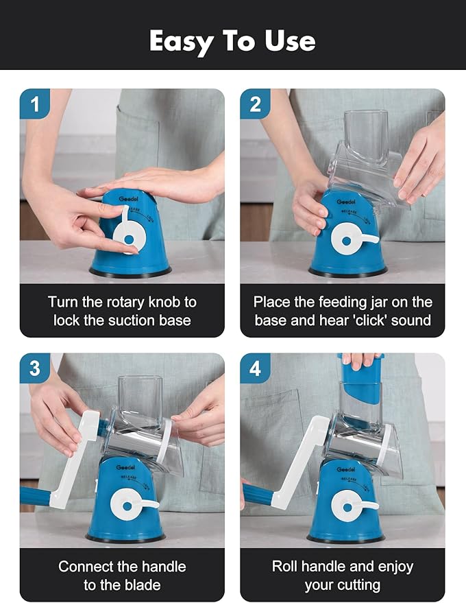 - Safe to Use : The cheese shredder is made of premium food grade ABS material, no BPA, so you can grate cheese or vegetables with confidence, which is safe for food preparation. Zero touching the blades with hands to ensure safe operation
