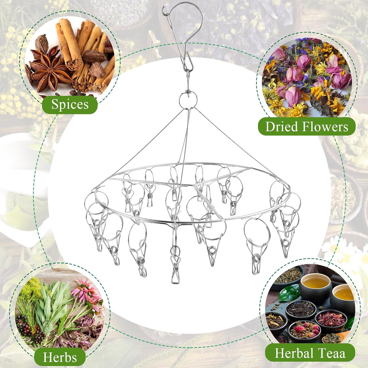 - Multifunctional:The hanging drying rack design for drying spices, herbs, dried flowers and herbal Tea. Also works great as a laundry drying rack, to hang hats, socks, towels, ties, scarves and other small items.