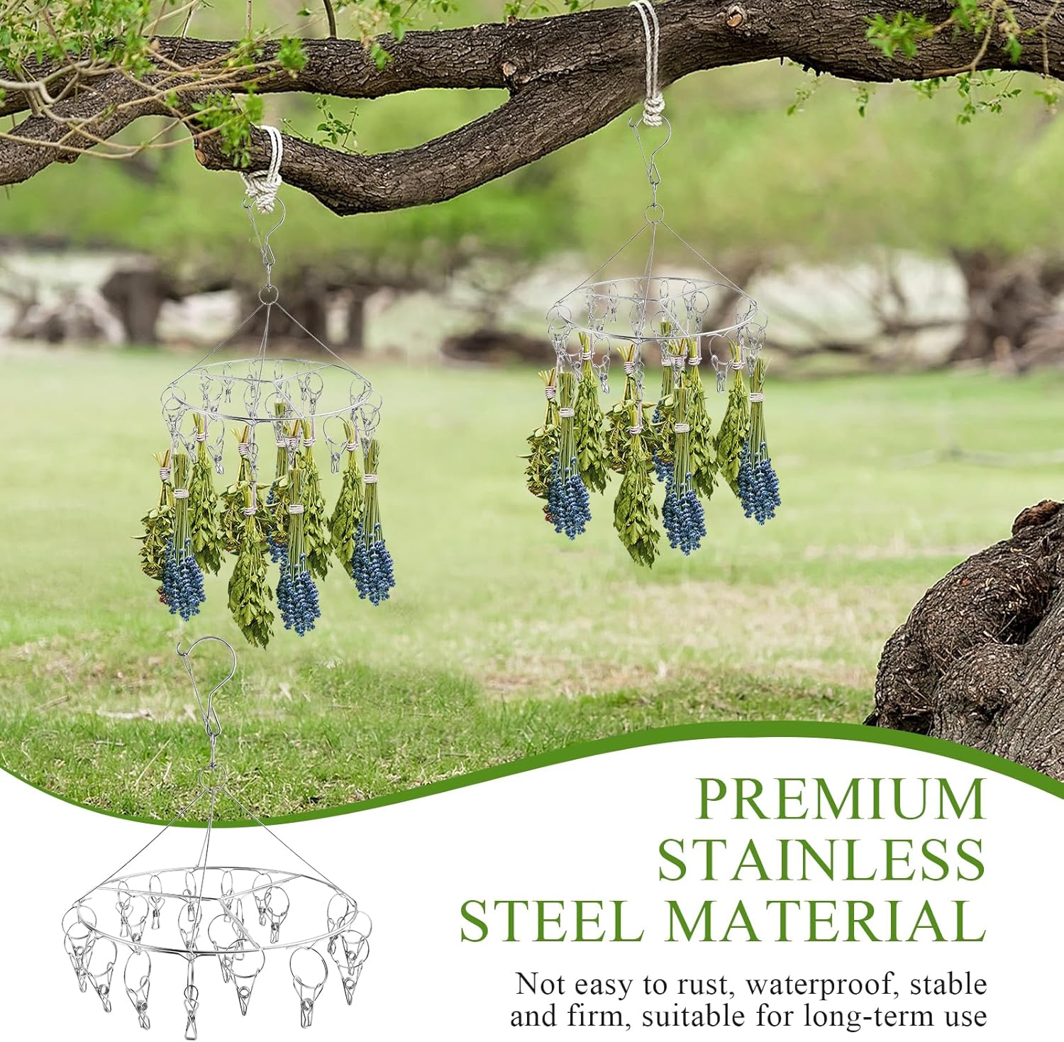 - Firm and Safe: Made of high-quality stainless steel, rustproof and strong load-bearing capacity, providing a sturdy and reliable solution for your herb drying needs. Windproof hook prevent the rack is not blown by the wind