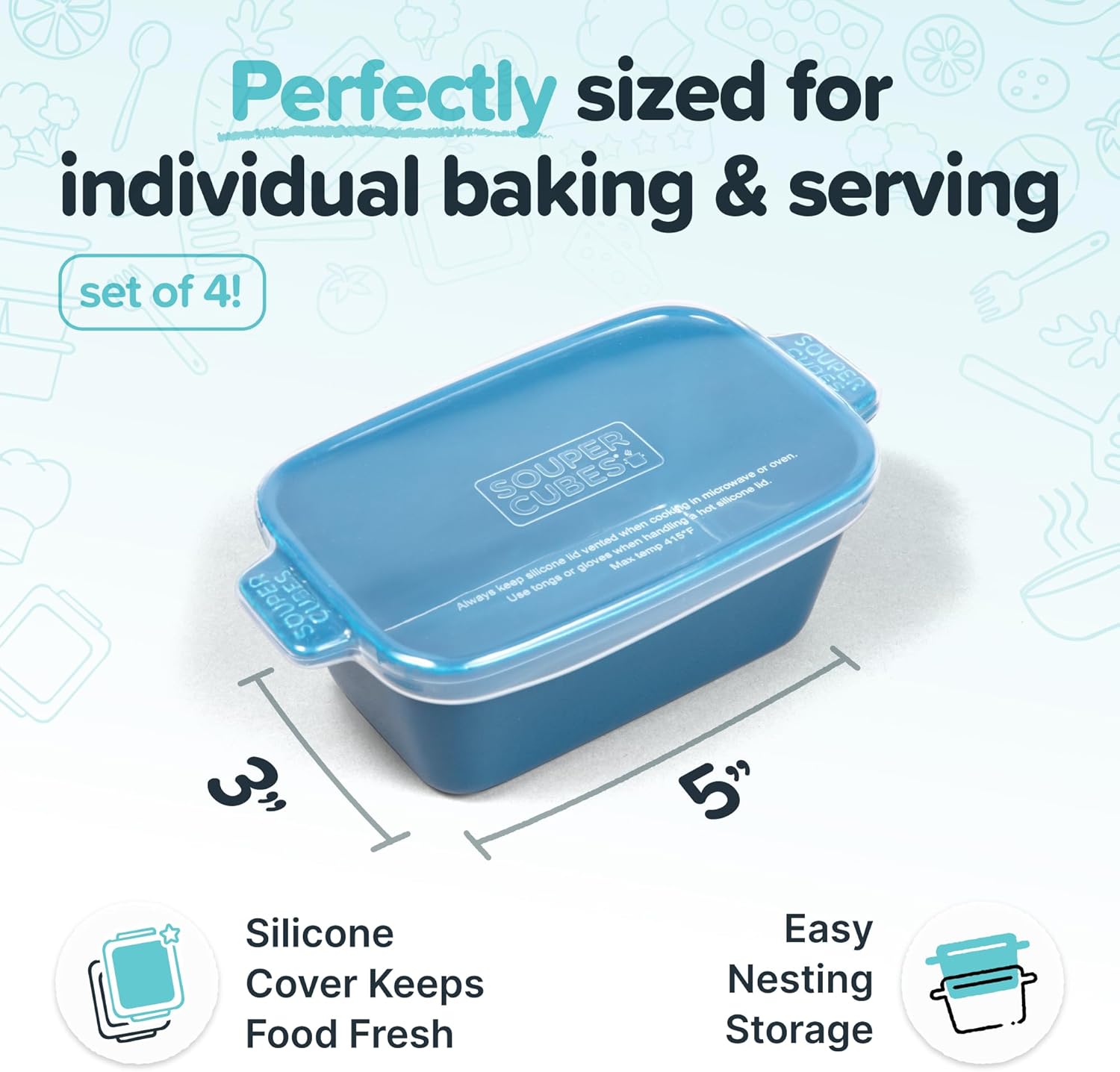 Souper Cubes Stoneware - Small Ceramic 5" x 3" Baking Dish with Silicone Covers, Small Baking Dishes for Oven Perfect for Reheating Single Serve Portions, Set of 4 - Blueberry