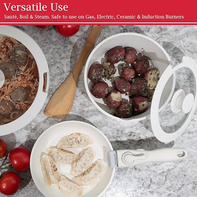 - STACKABLE DESIGN WITH REMOVABLE HANDLE - With a conveniently detachable handle, this pot set is stackable for compact storage. The cookware can be used with or without the handle and is ideal for use in small kitchens, apartments, RVs, or while camping.