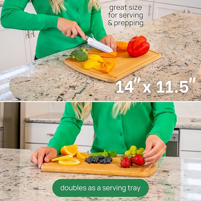 - FAMILY-SIZED VERSATILITY – At 15 inches, this glue-free bamboo cutting board strikes the perfect balance between compact and spacious. Ideal for chopping vegetables, carving meats, or plating cheese and charcuterie, it’s the all-purpose board every kitchen needs.