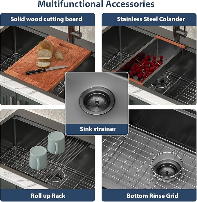 - Workstation Kitchen Sink- The package comes with all the CUSTOMIZED accessories needed, topmount kitchen sink x1, cutting board x1, dish rack x1, bottom grid x1, drain assembly x1, colander x1, mounting clips 1 set, cutout template paper, instruction
