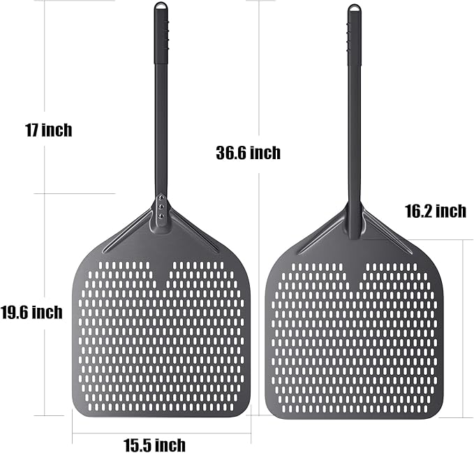 - LARGE HEAD WITH PERFORATED DESIGN: Head Size is 15.5" (W)x 16.2" (L). The perforated design allows to release the flour from the bottom of the peel, for a perfect pizza every time. Making the bottom of the pizza more crispy